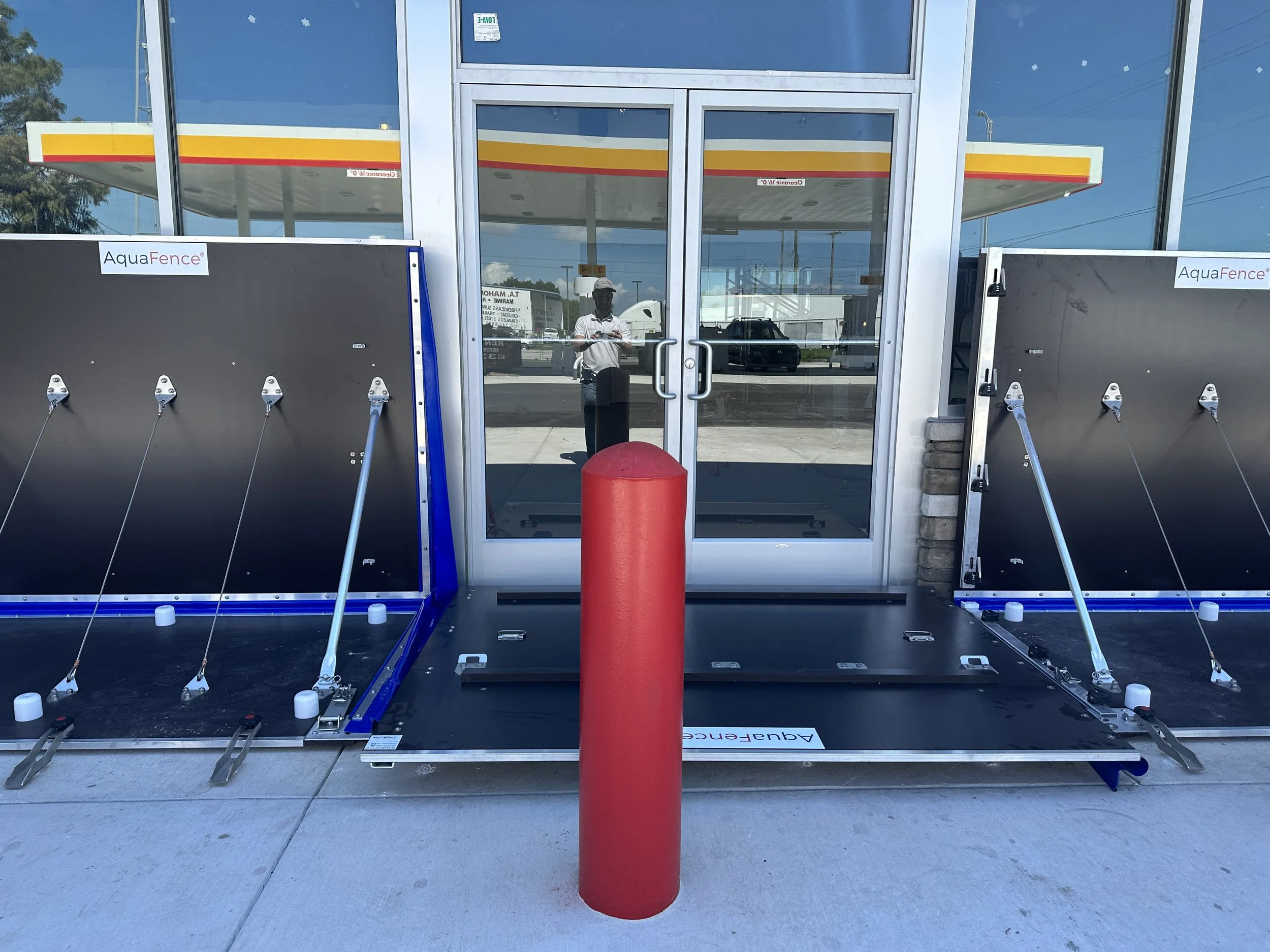 Integrated protection at vulnerable egress points was required to protect the gas station from potential flooding. To avoid the the bollards, hybrid FloodWall modules were required,.